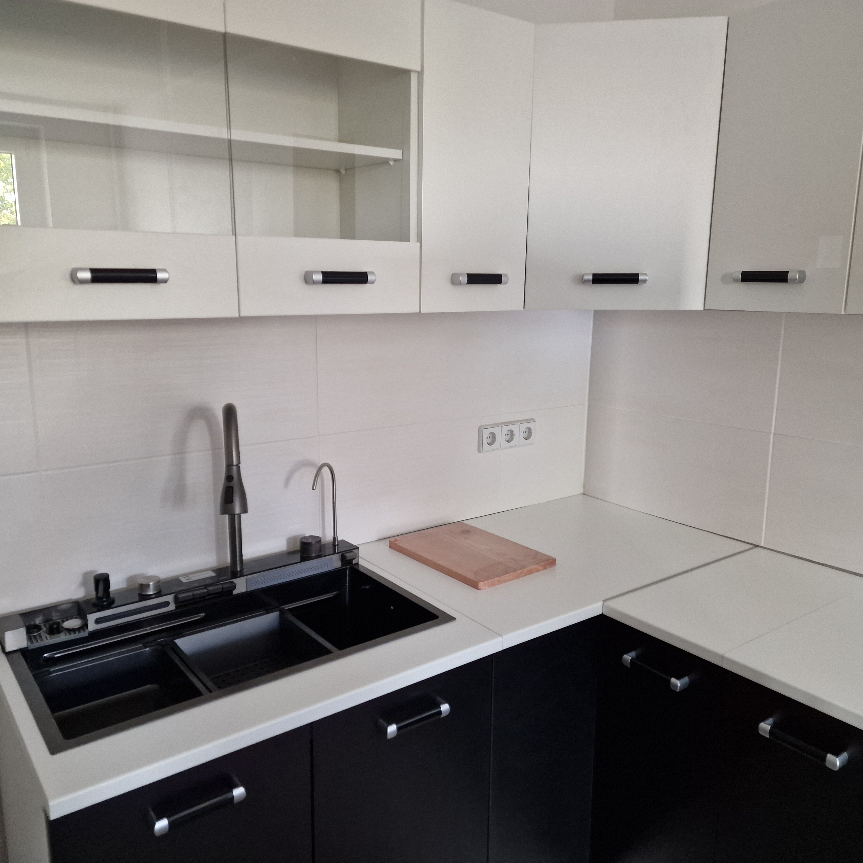 Unser Team hat eine hochwertige Schüller-Küche aufgebaut – mit clever integrierten Steckdosen und einer modernen Wasserfilteranlage.