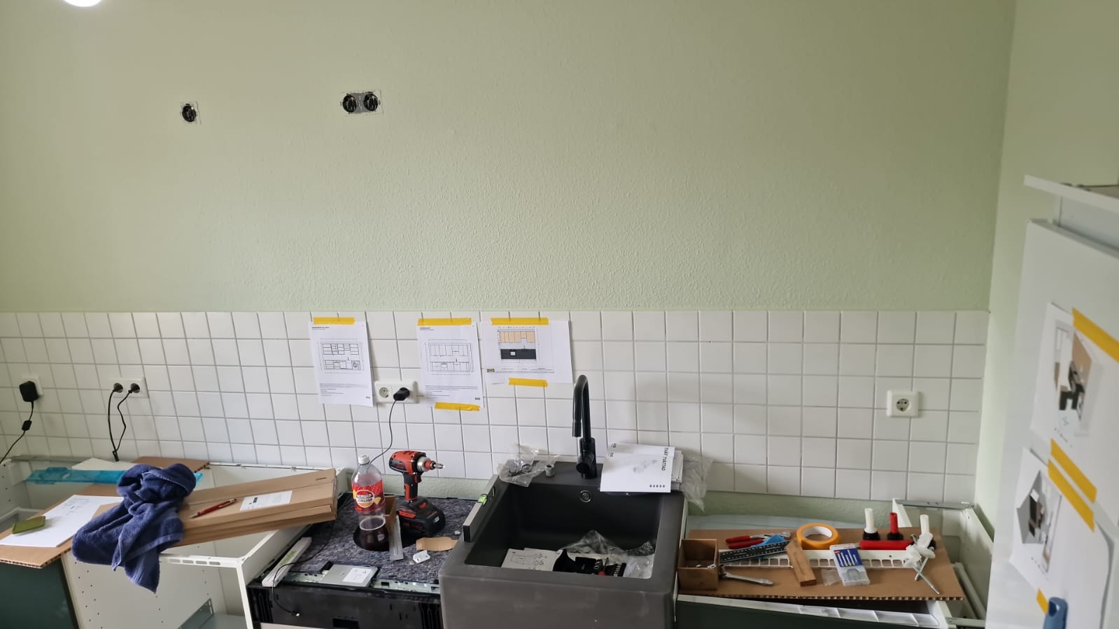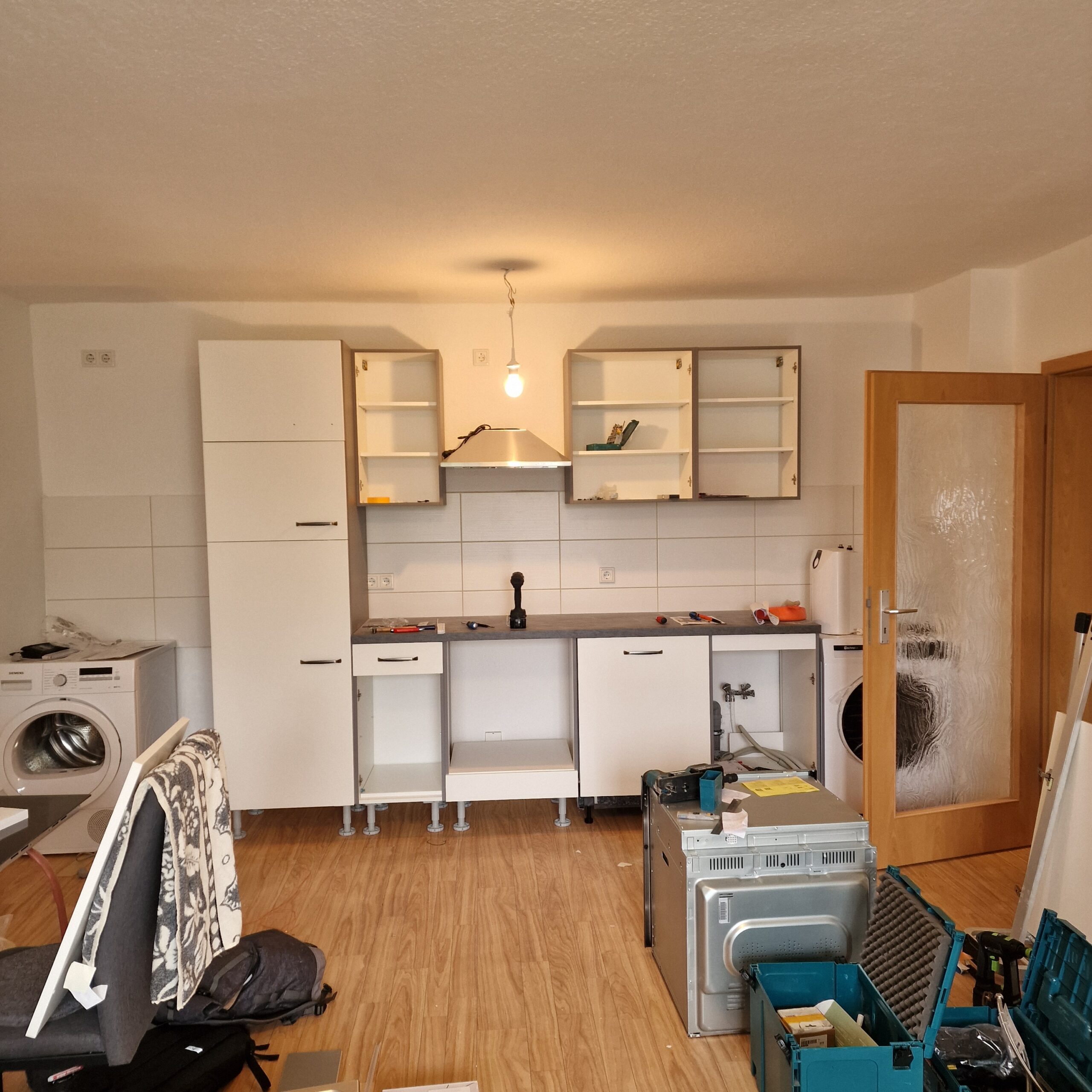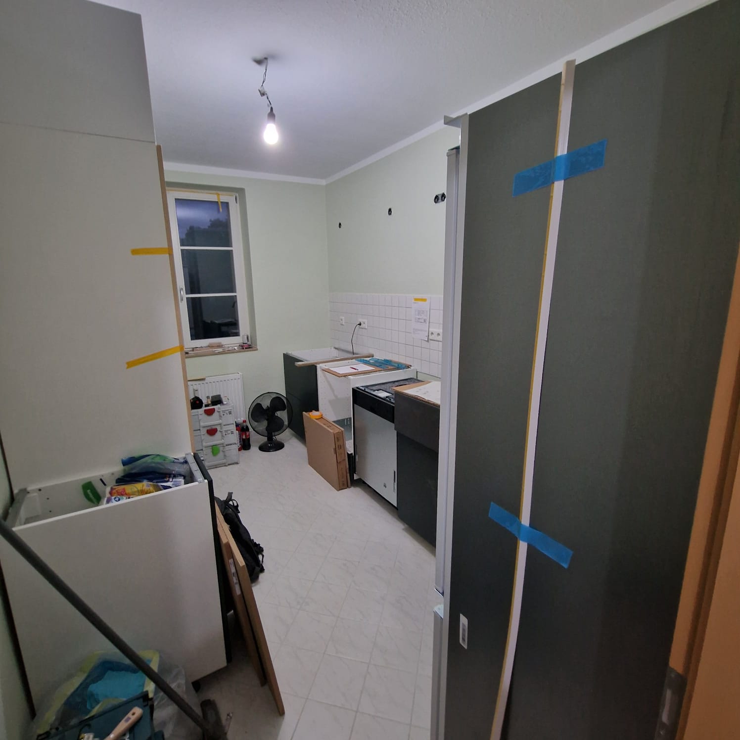Aufbau einer Omega-Winkelküche (170 × 250 cm). Die Herausforderung: kaum Platz, da der Raum bereits voller Umzugskisten stand .