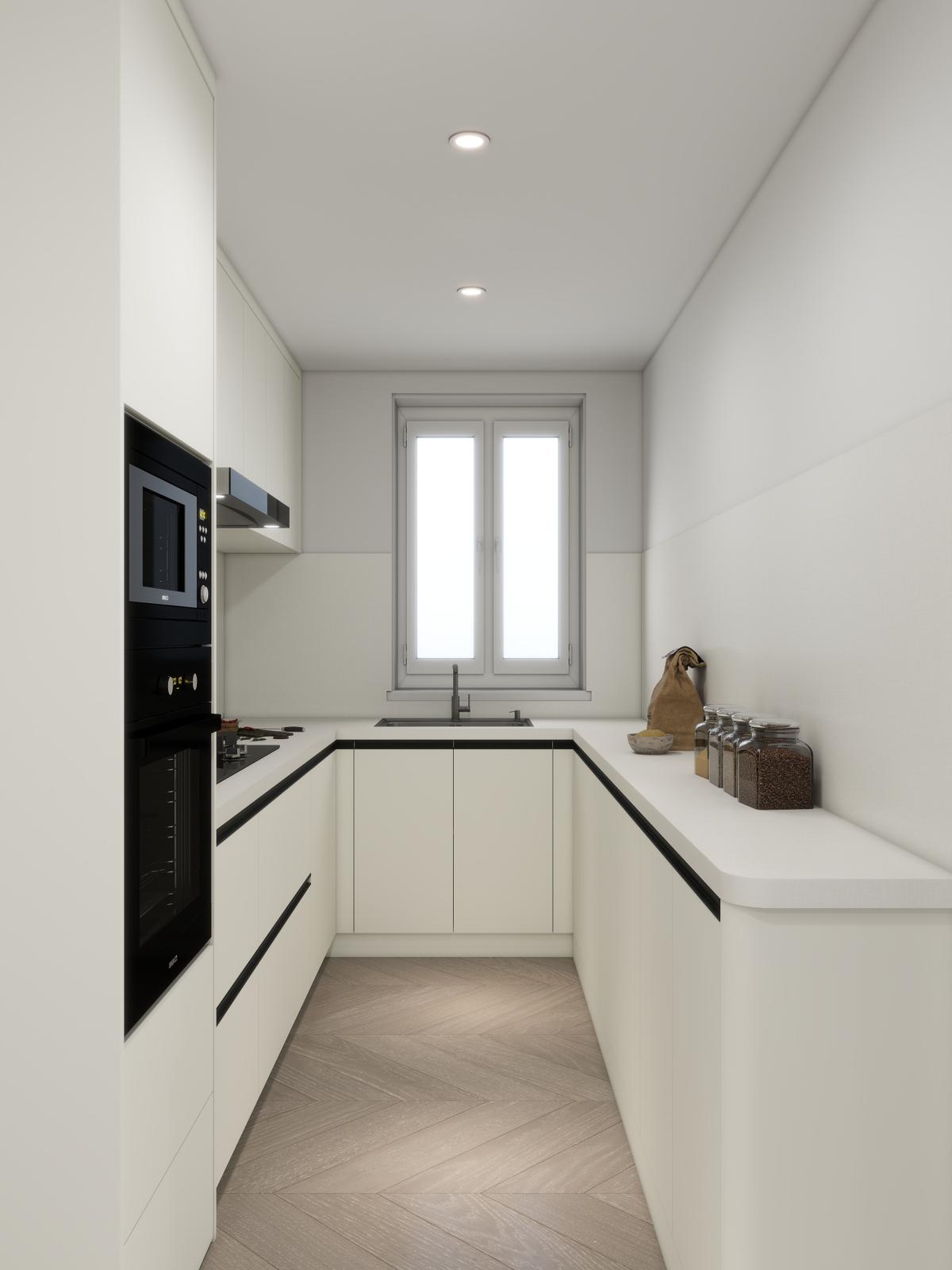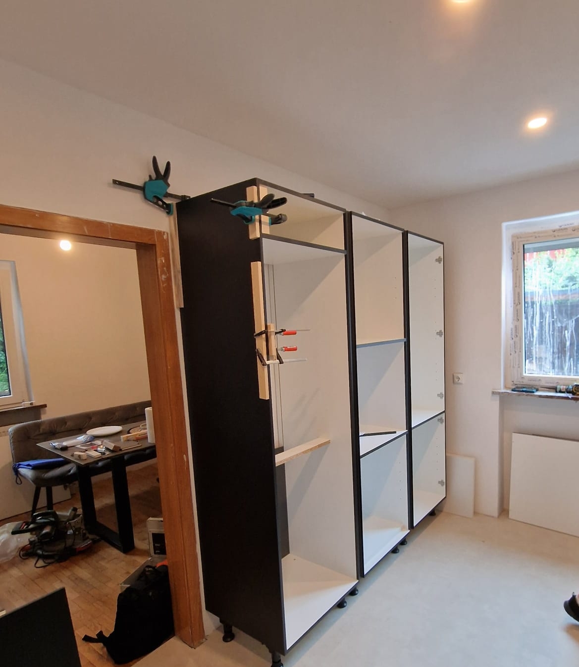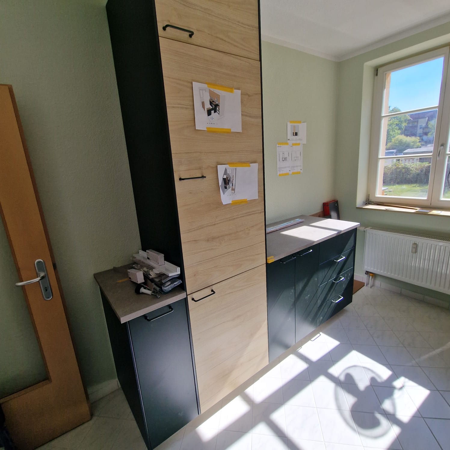 Aufbau einer Omega-Winkelküche (170 × 250 cm). Die Herausforderung: kaum Platz, da der Raum bereits voller Umzugskisten stand .